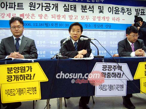 경실련은 이어 “건교부가 공개한 ‘판교신도시 사업원가 내역’을 분석해보니 평당 575만원이면 조성할 수 있었던 땅을 평당 평균 989만원으로 비싸게 팔아 토지공사 4439억원, 주택공사 6379억원, 성남시가 2398억원으로 총 1조3215억여원의 이득을 취했다”고 주장했다.