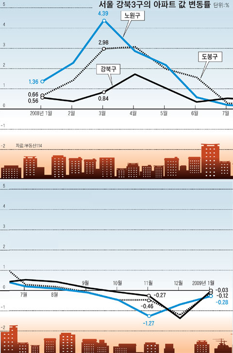 주택경기 침체가 시작되던 지난해 상반기에도 집값이 가파르게 올랐던 서울 강북3구(노원·도봉·강북)가 최근 '이중고(二重苦)'를 겪고 있다. 집값이 지난해보다 많게는 30% 이상 떨어졌는데도 매수세가 종적을 감춘 데다 방학 특수를 맞은 전세 시장마저 꽁꽁 얼어붙은 것이다. 정부의 부동산 규제 완화와 잠실 제2롯데월드 건축 허용 등 개발에 대한 기대감으로 최근 강남 재건축 아파트 값이 반등세로 돌아선 것과는 대조적인 모습이다.