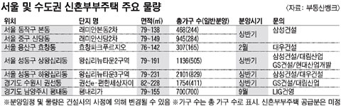 올해 공급 예정인 신혼부부 주택의 물량은 분양 2만5000가구, 임대 2만5000가구. 이 가운데 삼성건설은 올 상반기 서울 중구 신당동에서 분양하는 아파트 945가구(79~149㎡) 가운데 10~30% 정도를 신혼부부에게 특별 공급할 예정이다. 지하철 2·6호선 신당역과 2·5호선 청구역을 도보로 이용할 수 있으며 북한산과 남산이 보인다. 무학봉 근린공원과 대현산 근린공원이 인접하고 신당초·성동고 등 교육시설도 인근에 있다. 대우건설이 다음 달 서울 용산구 효창동에 선보이는 아파트(165가구·76~142㎡) 중에 76㎡형은 신혼부부용 주택이다. 지하철 6호선 효창공원앞역이 도보로 3분 거리에 있고 주변에 용산국제업무지구와 용산민족공원이 들어설 예정이다. 삼성건설·대림산업·GS건설·현대산업개발은 서울 성동구 상왕십리동에서 아파트 1136가구(79~191㎡) 가운데 505가구를 일반에 분양한다. 지하철 2호선 상왕십리역과 신당역이 인접해 있다.