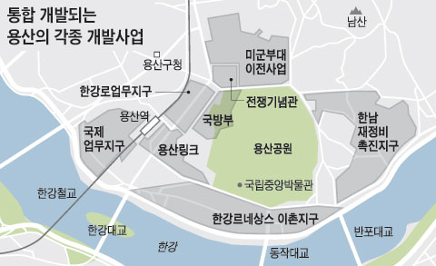 서울역~한강을 잇는 용산 한강로 주변 661만㎡(약 200만평)가 서울 도심을 대체할 신부도심으로 개발된다. 서울시는 이를 위해 용산국제업무지구, 한강 르네상스 이촌지구, 미군 부대 이전지, 재개발구역 등 제각각으로 나눠 추진되는 사업을 통합 연계해 개발할 방침이다.