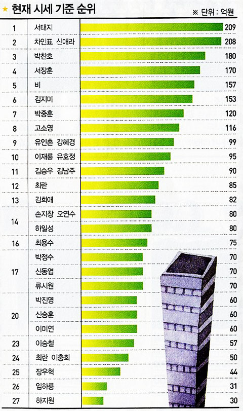 <이코노미플러스>가 강남 지역 스타 빌딩 27개의 현재 시세를 조사한 결과, 1위는 ‘문화 대통령’ 가수 서태지의 논현동 빌딩으로 나타났다. 2009년 6월 현재 시세는 209억원. 이 빌딩은 서태지와 그의 부친인 정상규씨가 지난 2002년에 함께 구입한 것이다. 빌딩이 위치한 논현동 차병원 사거리는 병원 밀집지인데, 역삼동과 삼성동, 강남역 등 강남의 주요 지역으로 넘어가가는 중간 기착지다.