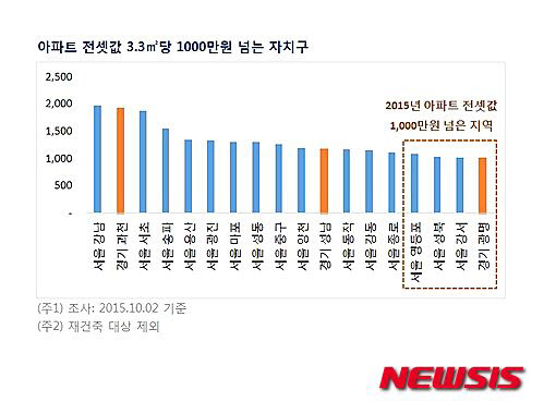아파트 3.3㎡당 전셋값이 1000만원을 넘어선 지역이 18곳으로 늘어났다.