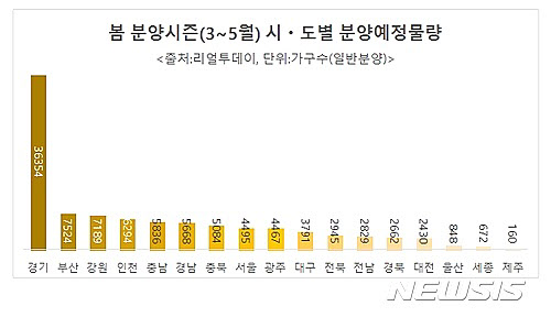 전국 시도별로 살펴보면 경기에 전체 물량의 36.6%를 차지하는 3만6354가구가 공급된다. 부산 7524가구(7.6%), 강원 7189가구(7.2%), 인천 6294가구(6.3%), 충남 5836가구(5.9%) 순이다.