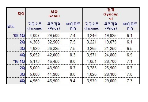 2008년 1분기 서울 아파트PIR지수는 7.4로 국민은행이 이 지수를 집계한 이래 가장 낮은 값을 기록했다. 당시 가구소득은 4007만원, 주택가격은 2억9500만원이다.