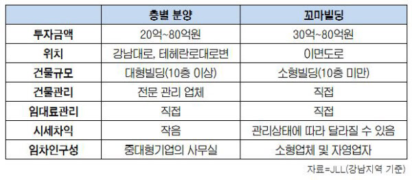 층별 분양하는 섹션 오피스와 꼬마빌딩은 몇가지 차이가 있다. 꼬마빌딩은 강력한 오너십(ownership)을 가지고 빌딩의 리모델링, 임대차관계, 인테리어, 시설관리 등을 결정하고 관리해야 한다. 소유주의 결정은 임대료에 중요한 역할을 한다. 반면 층별 분양 오피스는 전문업체에서 관리를 담당해 투자자가 안정적인 임대 수익을 올릴 수 있다.