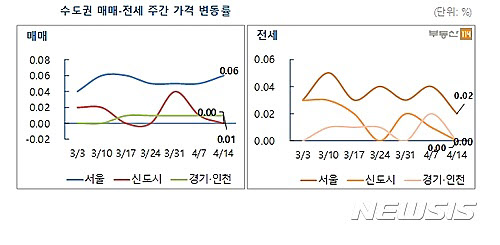 전세시장도 매매가와 같은 양상을 보였다. 서울은 나홀로 0.02% 상승한 반면 신도시와 경기·인천은 보합했다.