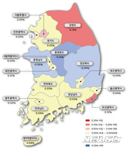 주요 시도별 매매가격은 강원(0.12%), 부산(0.10%), 전남(0.04%), 제주(0.04%) 등은 강세를 이어갔다. 충북(-0.10%), 경북(-0.09%), 충남(-0.06%), 울산(-0.04%) 등은 약세를 보였다.