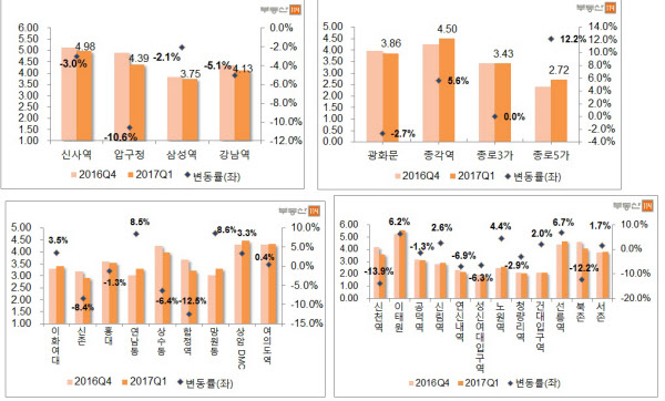 도심권역에서는 종로5가(12.2%)와 종각역(5.6%)은 임대료가 상승했지만 광화문(-2.7%)은 하락했다. 종로5가는 직장인 상주 수요 중심으로 상권이 유지되는 가운데 대로변 신축상가 매물이 1㎡당 4만원 수준에서 출시되면서 평균 임대료 수준이 상승했다.