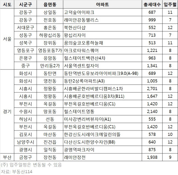 성북구 장위동 '꿈의숲코오롱하늘채' 513가구와 영등포구 영등포동7가 '아크로타워스퀘어' 1221가구, 은평구 응암동 '힐스테이트백련산4차' 963가구, 중구 만리동2가 '서울역센트럴자이' 1341가구 등이다.