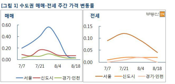 반면 가장 큰 폭 하락한 과천시는 8·2대책 이후 매수세가 뜸해진 분위기다. 부림동 주공8단지에서 1000만원 가량 하락했다. 수도권 전세시장은 여름 휴가철 비수기를 맞아 안정적인 분위기를 이어갔다.