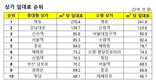 소형 상가 임대료가 가장 비싼 지역은 명동이다. 1층 기준으로 1㎡ 당 임대료가 24만1600원이다. 2위는 신림역으로 12만3600원, 3위는 서울대입구역으로 8만5900원을 기록했다. 뒤를 이어 수원역, 혜화동, 수원팔달문 로터리, 청담, 서울역, 종로, 테헤란로, 광화문, 홍대합정, 강남대로 순으로 임대료가 비쌌다.