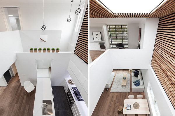 이 집의 특징은 다양한 천장 높낮이다. 1층 주방과 거실은 두 개 층 높이의 천장이고, 좀 더 아늑한 침실로 향하는 복도에 들어서면 한 개 층 천장 높이로 낮아진다. 삼나무 마감재가 옆 벽과 천장을 둘러싸고 있어 따뜻함과 웅장한 감성을 만들어낸다. 시각적으로는 직선 경로를 강조하기 위해 긴 검은색 트랙 조명을 설치했다.