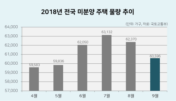 30일 국토교통부는 9월 말 기준 전국 미분양 주택이 6만596가구로, 8월(6만2370가구)보다 2.8% 감소했다고 밝혔다. 지난 6월 6만2050가구에서 7월 6만3132가구로 늘었다가, 이후 8월(6만2370가구)과 9월(6만596가구) 연속 감소한 것이다.