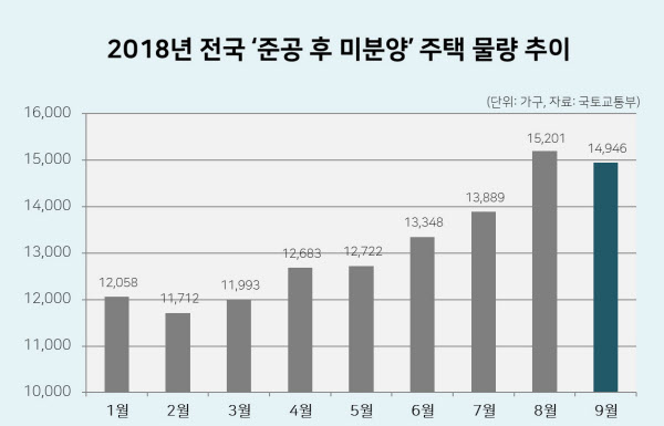 미분양 중에서도 악성으로 꼽히는 ‘준공 후 미분양(건물이 완공된 후에도 미분양으로 남아있는 것)’도 7개월만에 하락 전환했다. 지난 2월(1만1712가구) 이후 6개월 동안 연달아 증가했는데, 8월(1만4201가구)에서 9월(1만4946가구)로 넘어오면서 1.7% 감소했다.