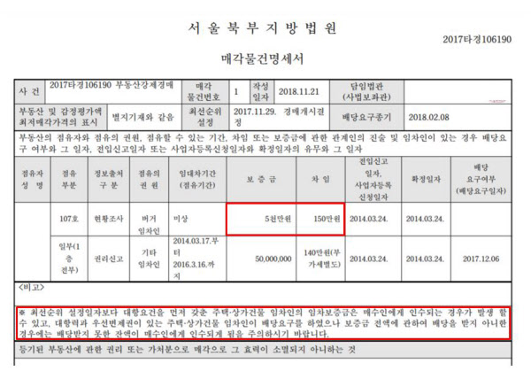 결론부터 말하면 W씨는 안심해도 된다. 본 건의 경우 임차인은 기준권리보다 앞서 건물을 인도받으면서 사업자등록도 마쳤다. 여기에 임대차계약서에 확정일자까지 받았다. 임대차 보증금 5000만원과 월 임대료 150만원을 감안하면 환산보증금은 2억원이다. 법에서 정한 한도를 초과하지 않는다. 대항력과 우선변제권도 있고 배당요구까지 해놓은 상태다.