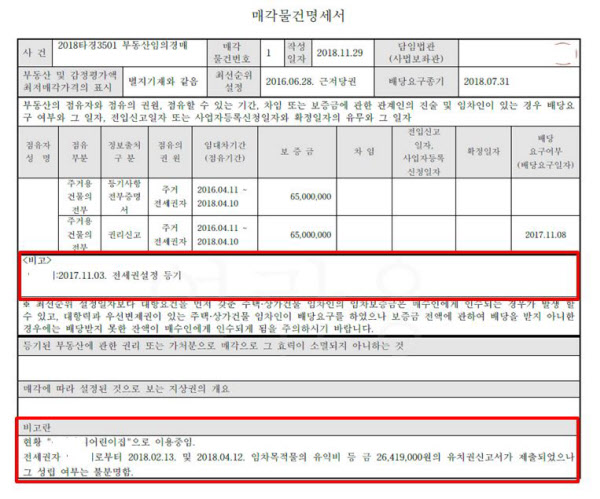 그런데 매각물건명세서를 보니 유치권이 신고돼 있었다. 좀 더 자세히 보니 이 집은 어린이집으로 이용하고 있었다. ‘전세권자 양모씨로부터 임차목적물의 유익비(有益費, 임차된 부동산의 가치를 올리기 위해 투자한 비용)에 대해 유치권 신고서가 제출됐지만 그 성립 여부는 불분명함’이란 내용이 있었다.