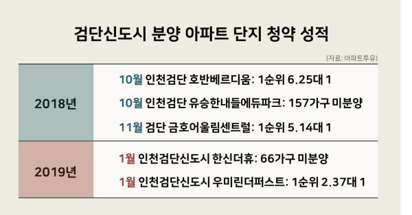 마지막 2기 신도시인 인천 검단신도시 아파트 분양이 올해 본격 시작했지만, 당초 전문가들이 우려했던 대로 미분양이 속출하고 있다. 올해 들어 분양한 아파트들의 청약 성적이 첫 분양인 지난해 10월보다 더 부진하게 나타났다.