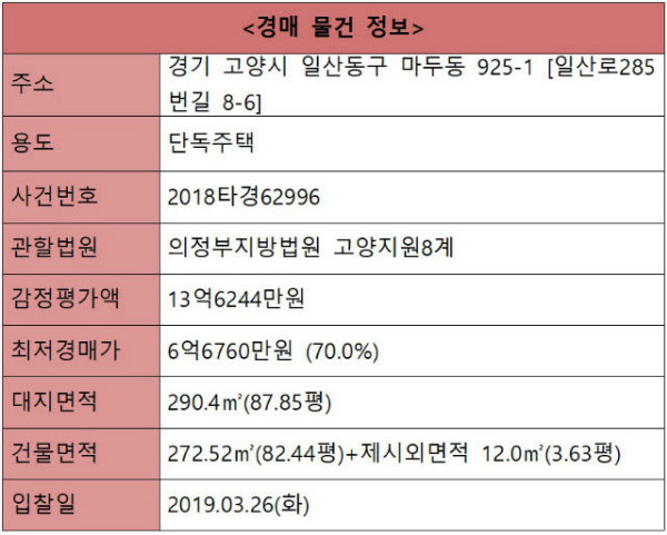 경기 고양시 일산동구 마두동 소재 국립암센타 남동측 인근에 위치한 단독주택이다. 1997년 10월에 준공됐다. 지하1층~지상2층 주택으로 지하1층 68.04㎡, 지상1층 117.72㎡, 지상2층 78.12㎡, 총 연면적 272.52㎡(82.44평) 규모이다. 전층 모두 주택으로 이용하고 있다. 토지면적은 290.4㎡(87.85평)로 제1종전용주거지역으로 남서향이며, 8m 내외의 도로에 접해 있다.