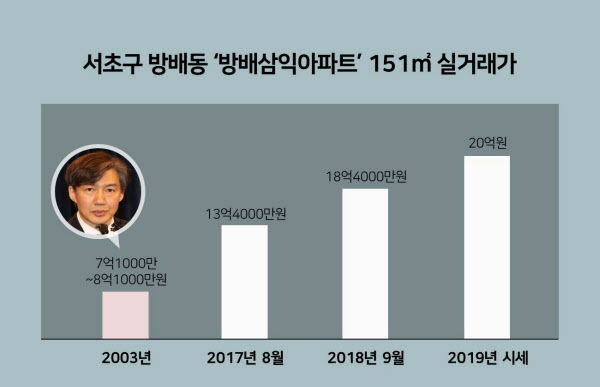 조 수석은 2003년 5월부터 방배삼익아파트를 약 16년간 보유해온 것으로 알려졌다. KB시세에 따르면 2003년 이 아파트 매매평균가는 7억1000만~8억1000만원이다. 현재 온라인 부동산중개 사이트에는 20억원에 매물이 나와있다. 시세 기준으로 조 수석이 주택을 매입한 이후 집값이 최소 11억9000만원 이상 오른 셈이다.