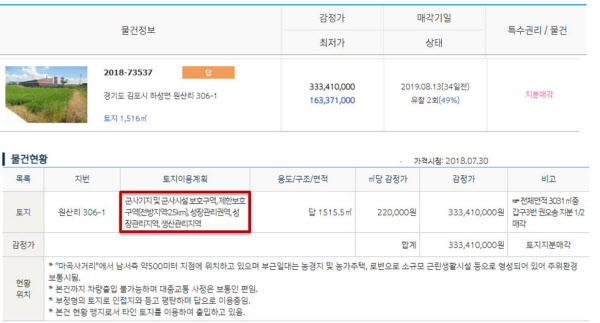경기 김포시에 거래처를 여럿 두고 있는 자영업자 L(51) 씨. 다음달 13일 3차매각기일을 앞두고 있는 김포시 하성면 원산리 땅 1515.5㎡(부천지원 사건번호 2018-73537)가 경매에 나온 것을 보고 매수해 볼 생각이다. 최저입찰가는 1억6337만원으로, 최초감정가(3억3341만원) 대비 51%나 떨어진 상태였다.