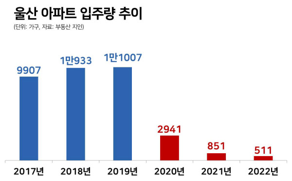 두 번째 이유로는 새 아파트 공급 부족이 꼽힌다. 내년부터 3년 동안 울산 아파트 입주량은 ▲2020년 2941가구 ▲2021년 851가구 ▲2020년 511가구 순으로 점점 감소한다. 울산 인구가 115만명에 달하는 것을 고려하면 공급이 사실상 ‘중단’ 됐다고 볼 수 있다. 이마저도 지역민들이 선호하는 울산 도심(남구·중구)가 아니라, 상대적으로 개발이 더딘 북구·울주군 택지지구에 분양하는 단지가 대부분이다. 지역 경제가 침체됐던 지난 2~3년 동안 건설사들이 울산에 아파트 분양 계획을 포기한 결과다.