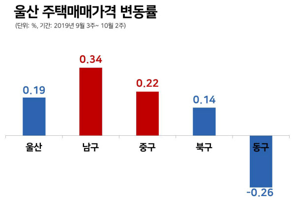 지역의 핵심 산업이었던 조선·중공업 침체 여파로 130주 연속 하락세를 보였던 울산의 집값이 최근 상승세로 돌아섰다. 한국감정원 조사에 따르면 울산 주택매매가격 변동률은 2017년 3월 2주부터 올해 9월까지 하락세를 기록했다. 2년 6개월 동안 하락세를 보인 것이다. 끝없이 빠지기만 하던 울산의 집값이 지난 9월 세번째주 보합세로 전환했고, 9월 4주째부터는 상승세를 보이고 있다. ▲9월 4주 0.03% ▲9월 5주 0.06% ▲10월 1주 0.04% ▲10월 2주 0.06% 등이다.