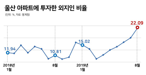 울산 거주자가 아닌 다른 지역의 투자자도 울산으로 몰려 들고 있다. 매입자 거주지별 통계에 따르면 올해 8월 울산 아파트를 사들인 사람들 중 외지인(관할 시도외, 서울 포함) 비율은 22%다. 지난해 같은 기간 10.8%였던 것과 비교하면 2배 이상 많다.