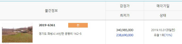 경기 화성시에 살고 있는 H(42)씨는 요즘 땅을 알아보러 다니느라 혈안이다. 은퇴한 남편이 주말농장을 만들겠다고 노래를 불러대서다. 그동안 고생한 남편을 위해 주말농장 겸 투자까지 염두에 두고 매수할만한 토지를 알아보기로 결심했다. 그러던 중 다음달 31일 2차매각기일을 앞두고 있는 화성시 서신면 궁평리 1451㎡ 땅(지목 전, 수원지방법원 사건번호 2019-6361)을 발견했다. 최저입찰가는 최초감정가(3억4098만원) 대비 30% 떨어진 2억3869만원이었다. 이만하면 주변 시세보다 저렴했다.