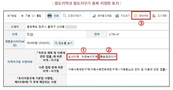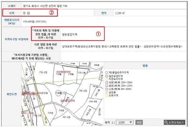 여기서 흔히 ②번에 적힌 ‘지목’(地目)을 토지의 용도라고 오해하는데, 지목은 그 토지가 어떻게 쓰이고 있는지를 나타낸 것일뿐, 토지의 정해진 용도가 아니다. 토지의 용도는 토지이용계획확인서의 ①부분에 표시된다. 여기에 나타난 ‘일반공업지역’이 토지의 용도 규제 중 대표적인 ‘용도지역’이다.