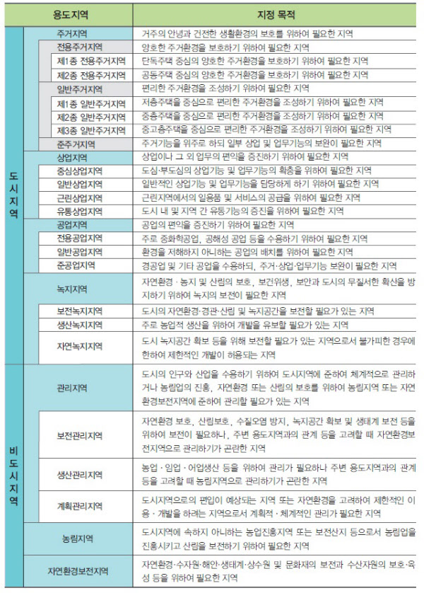 용도지역이란 토지를 경제적이고 효율적으로 이용하고 공공복리를 증진하기 위해 건축물의 용도·건폐율·용적률 등을 제한하기 위해 지역별로 가능 용도를 나눠놓은 것을 말한다. 용도지역은 전 국토의 모든 토지에 지정돼 있다.