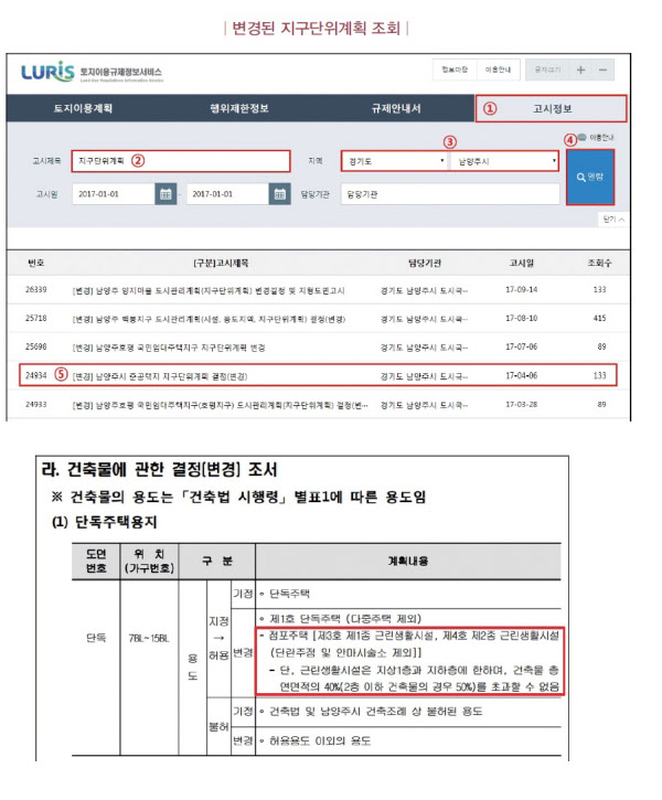 그렇다면 지구단위계획은 어디서 열람할 수 있을까. 지구단위계획은 시청 홈페이지에 올라 있다. 찾기 쉽지 않다면 시청 지구단위팀에 전화해 담당자에게 지번을 불러주고 물어보면 알 수 있다. 이후 개별 지구단위계획에 따라 허가된 건축물과 허가되지 않은 건축물을 구분하면 된다.