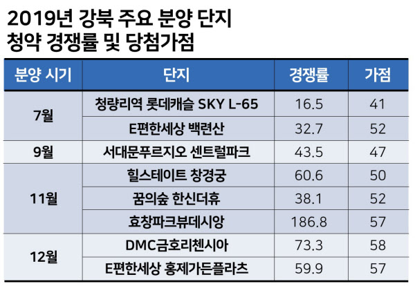 [땅집고] 정부가 민간택지에도 분양가 상한제를 적용하기로 한 이후부터 청약 시장에서 ‘가점 인플레이션’ 현상이 심화하고 있다. 서울 외곽에 있는 중소 규모 아파트 단지들의 청약 커트라인도 84점 만점에 60점대까지 오르는 추세다.