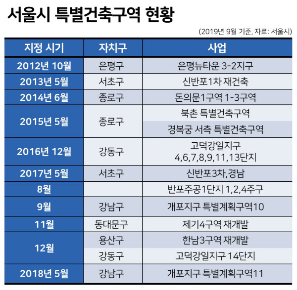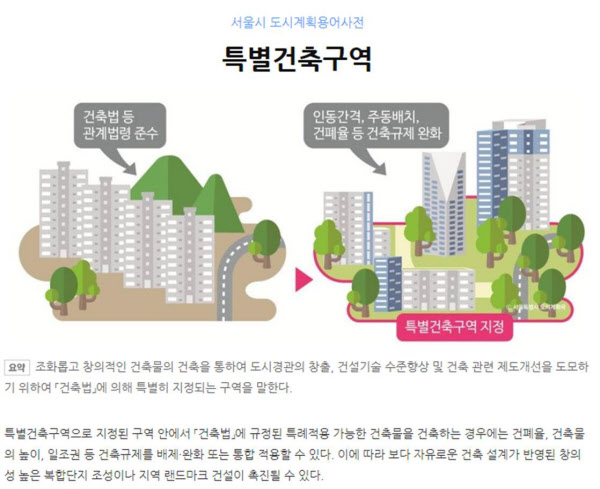 현재 서울시는 특별건축구역에 짓는 건축물에 대해 건페율, 건축물 높이, 일조권 등 건축규제를 일부 완화해주고 있다. 대신 이 구역에 신축하는 건축물은 주변 환경과의 조화 및 공공성을 고려해야 한다는 게 서울시의 주장이다.