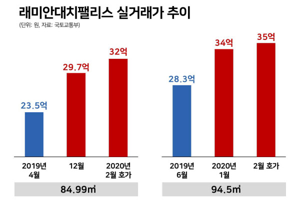[땅집고] 국토교통부 실거래가 자료에 따르면 서울 강남구 대치동 ‘래미안대치팰리스’ 아파트 94.5㎡(이하 전용면적)가 올해 1월 34억원(11층)에 팔렸다. 이 주택형 역대 최고가이자 최초로 30억원을 넘어섰다. 직전 최고가인 지난해 6월 거래(28억3000만원·11층)보다 5억7000만원 높은 금액이다.