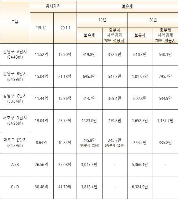 하지만 이 같은 보유세 예상치는 종합부동산세 인상안을 기준으로 산출한 것이 아니다. 3주택 이상 보유자와 조정대상지역 2주택 이상 보유자에 대해 종합부동산세 세율은 최고 3.2%로 중과하고 조정대상지역 2주택 이상 보유자에 대한 세 부담 상한은 200%를 기준으로 했다.