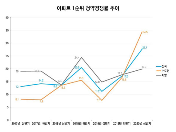 이 때문에 아파트 청약 시장 열기가 식을 줄 모른다. 서울 아파트 1순위 청약 경쟁률은 지난해 상반기 평균 16.8대1에서 올 상반기 74.6대1로 1년 만에 4배 넘게 치솟았다.