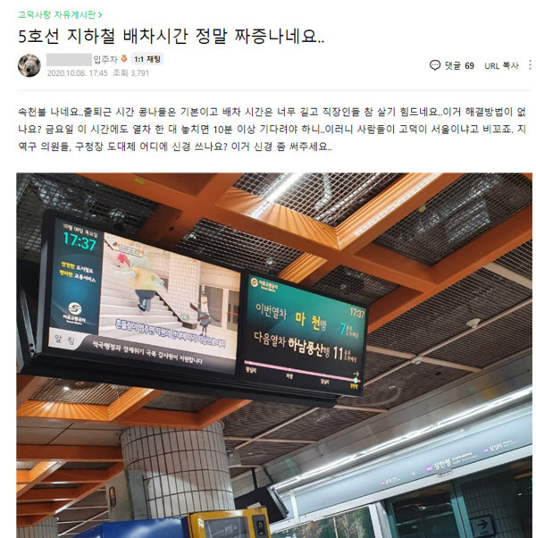 다만 5호선 배차 간격이 다른 노선보다 긴 점은 감안해야 한다. 출퇴근 시간에는 배차간격이 5~10분 정도로 짧은 편이지만, 평일 오후 1~5시나 공휴일에는 최대 20~25분까지 길어진다. 상일동역을 포함하는 5호선 하남풍산행 본선과 마천행 지선이 강동역 선로를 번갈아 쓰기 때문이다. 실제 온라인 커뮤니티에는 “출퇴근 시간 콩나물은 기본이고, 배차 시간이 너무 길다. 이러니 사람들이 고덕이 서울이냐고 비꼰다”는 내용의 불만 섞인 글을 쉽게 찾아볼 수 있다. 올해 3월 하남까지 이어지는 5호선 2단계 연장선(하남풍산역~하남검단산역)이 개통하면 지하철 이용 불편이 더 심해질 가능성이 크다.