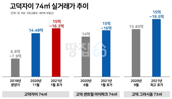 국토교통부에 가장 최근 등록된 ‘고덕자이’ 실거래가는 지난해 11월 74㎡(29평) 14억4800만원이다. 현재 온라인 부동산 중개사이트에 이 주택형 호가는 15억~16억3000만원이다. 호가 기준으로 2018년 분양가(6억8000만~7억9000만원) 대비 집값이 2배 넘게 뛴 것. 다만 아직 등기 전이라 매수세가 활발한 편은 아니다. 강창구 고덕스카이공인중개사사무소 대표는 “고덕자이는 전매제한 단지로, 현재 10년 보유 및 5년 거주 요건을 충족시킨 조합원 분양권만 거래 가능해 매물 자체가 얼마 없다”면서 “집주인들이 앞으로 고덕지구 아파트 가격이 더 오를 여지가 있다고 생각해 급매를 제외하면 매물이 안 나온다”고 했다.