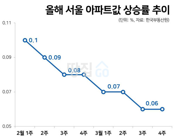 실제로 28일 한국부동산원에 따르면 서울 아파트 가격 상승률은 지난 2월 첫째주 0.10%로 최고치를 기록한 이후 0.09%(2월 2주), 0.08%(2월 3·4주), 0.07%(3월 1·2주), 0.06%(3월 3·4주)로 상승폭이 계속 둔화하고 있다.