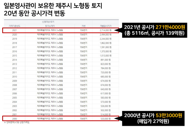 하지만 땅을 산 지 22년 동안 일본영사관은 건물을 신축하려는 움직임조차 보이지 않고 있다. 그동안 땅값도 수직 상승했다. 매입 당시인 2000년 공시지가가 ㎡당 53만3000원이었는데, 지난해 기준 271만4000원으로 5배 이상 뛰었다. 총 면적이 5116㎡이니 전체 부지 공시가를 계산하면 139억원 정도다. 매입 금액(27억원)을 고려하면, 일본영사관은 지난 22년 동안 최소 112억원 이상 차익을 올린 셈이다. 공시지가가 아닌 시세로 따지면 이보다 더 비쌀 것으로 보인다.