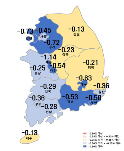 수도권도 하락폭이 줄었다. 인천은 시세보다 낮은 급매물이 줄어들며 지난주 낙폭(-0.99%)에 비해 감소해 -0.73%를 기록했다. 경기도도 지난주 -0.86%에서 이번 주 -0.72%로 하락세가 줄었다. 지방은 -0.41%로 지난주(-0.50%)보다 낙폭이 둔화했다.