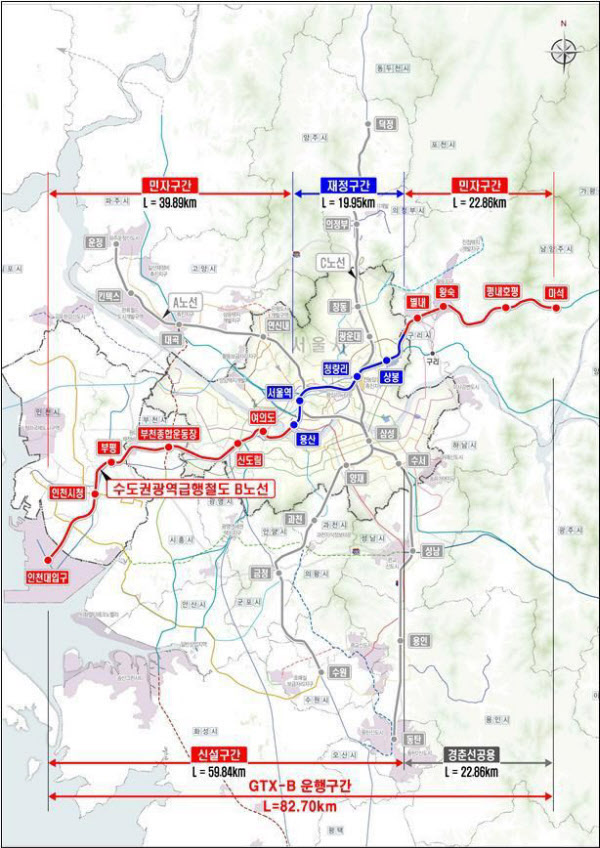 인천 송도와 경기도 마석을 잇는 GTX-B 노선은 전체 82.7㎞ 중 인천대입구~용산과 상봉~마석구간 62.8㎞을 민자로, 용산~상봉 구간 19.9㎞를 재정으로 건설한다.