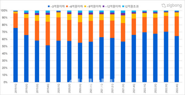 3억원 초과 6억원 이하 아파트 거래 비율은 전년 대비 늘어났다. 6억원 초과 매매 거래는 2021년 4분기 이후로 감소세를 보였다.