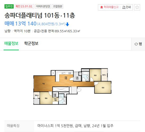 업계에 따르면 내년 1월 입주를 앞둔 서울 송파구 오금동 '송파더플래티넘' 전용 65㎡이 최초 분양가 14억 5140만원에서 1억5000만원 내린 13억140만원에 매물로 나왔다.