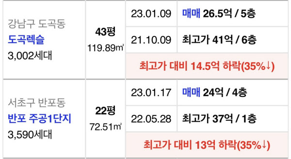 지난 한 달간 서울에서 가격 낙폭이 가장 컸던 아파트는 강남구 도곡동 ‘도곡렉슬’이다. 도곡렉슬 전용 119 ㎡의 경우 2021년 10월 41억원으로 최고가를 기록했는데, 지난달 9일 26억5000만원에 거래됐다. 최고가 대비 14억5000만원이 내려 35% 하락한 것이다. 도곡동 인근 A 중개사무소 관계자는 “최근 저가에 거래된 매물 말고는 거래가 이뤄지지 않고 있다"며 "매매도 전세도 약보합으로 침체에 접어드는 시기 같다”고 했다.