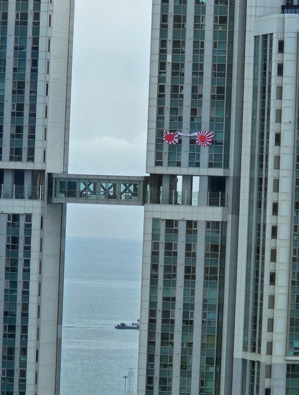 부산의 한 아파트에서 현충일 아침부터 일본 군국주의의 상징인 ‘욱일기’가 외벽에 걸려 있어 온라인 커뮤니티에서 비판이 쏟아지고 있다. 해당 아파트 관리사무소에는 이날 아침부터 입주민과 인근 지역주민 민원이 잇따르고 있다.