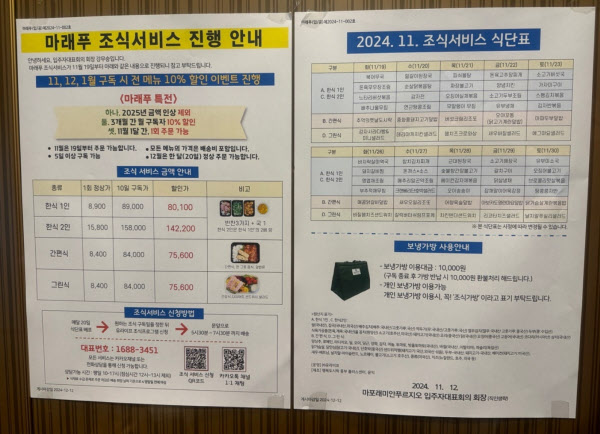 [땅집고] 서울 강북권을 대표하는 아파트로 꼽히는 마포구 아현동 ‘마포래미안푸르지오’ 입주자대표회의가 올해 11월 19일부터 조식 서비스를 시작했다고 밝혔다. 2014년 입주한 뒤 올해로 11년 만에 처음이다. 다만 다른 단지들과 달리 입주자들이 다 함께 이용하는 뷔페 방식이 아니라 단순 도시락 배달 형태라 제대로 된 조식 서비스라고 보기는 어렵다는 말이 나온다.