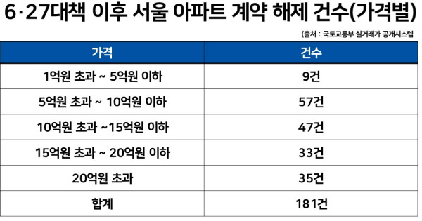 [땅집고] 고강도 대출 규제 정책이 나온 6월27일 이후 10일 동안 서울에서 발생한 아파트 계약 해제(청년안심주택 직거래 사례 제외) 3분의 1은 10억원 이하 아파트에서 발생한 것으로 드러났다. 20억원 초과(35건) 아파트 발생 건수의 2배에 가깝다. 서울 강남권과 마·용·성 한강벨트 고가 아파트 투기 수요를 줄이기 위한 정책이 내집마련 실수요자에게도 적잖은 영향을 주는 것으로 풀이된다.