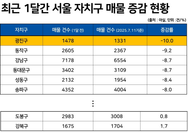 도봉(0.8%)과 강북(1.7%)을 제외한 전 자치구에서 매물이 사라졌다. 가장 많이 줄어든 곳은 광진(-10%)이다. 이어 동작(-9.2%), 강남·동대문(-8.7%),성동(-8.4%) 등으로 나타났다.