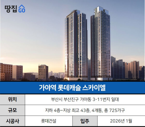 ‘가야역 롯데캐슬 스카이엘’은 지하 4층~지상 43층, 4개동, 총 725가구 규모다. 7월 28일 특별공급, 29일 1순위 청약을 나란히 받는다. 후분양 아파트라 입주는 2026년 1월로 비교적 빠른 편이다.